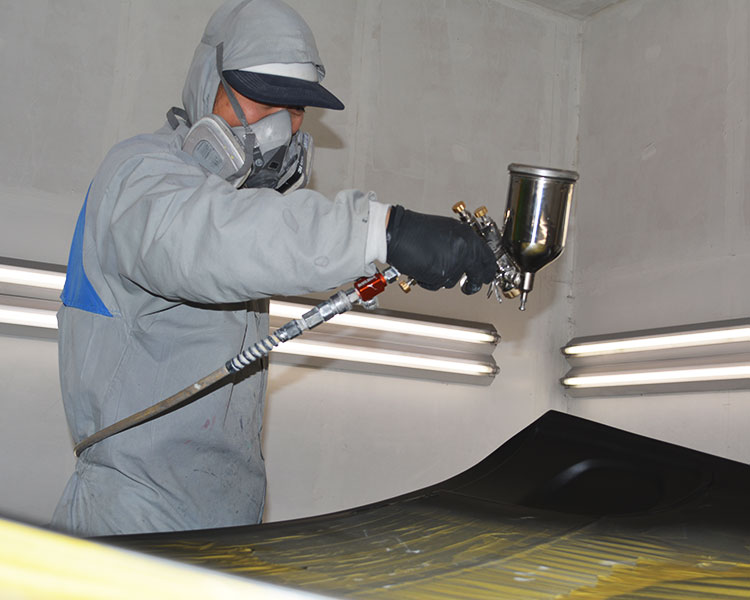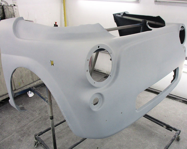 各パーツを足づけし、サフェーサー(下地塗料)をペイントします。 また、ピンホール(巣穴)や歪みのチェックをします。 ピンホールや歪みなどがあれば数種類の専用のパテを使い、滑らかに仕上げます。